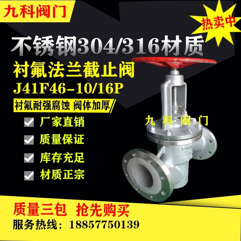 J41F46-16P不锈钢衬四氟法兰截止阀耐腐蚀耐酸碱钢衬四氟阀门DN50九科阀门-浙江九科阀门有限公司发布日期:2025-7-13