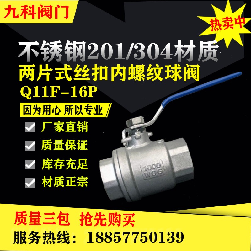 304不锈钢Q11F-16P二2两片式2pc丝扣口内螺纹全通径球阀4/6分DN15九科阀门-浙江九科阀门有限公司发布日期:2025-8-5